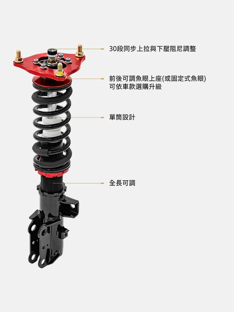 BC V1避震器兼顧性能、乘坐舒適與高速穩定性,加上車高及阻尼可調的特性,有效提升車輛操控樂趣。透過對車輛多次且廣泛測試,在性能提升與乘坐舒適度之間,取得最均衡的設定,提供對應車型應有的駕馭調性,是初入改裝避震器領域的絕佳選擇。