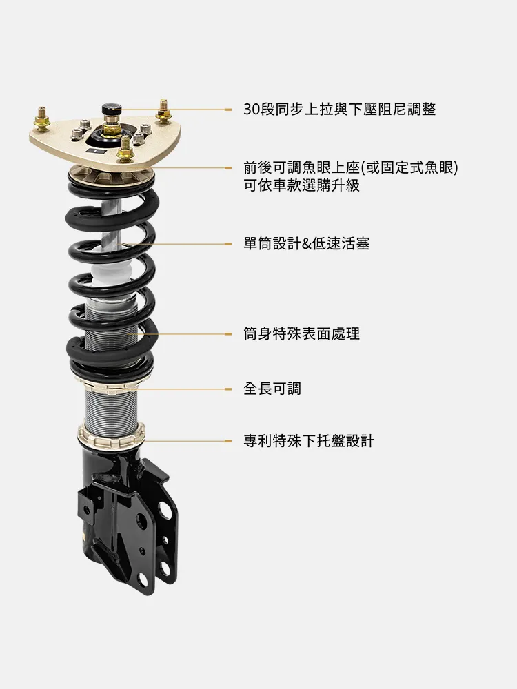 BC DS系列的低速活塞(Digressive)在低活塞速度(0-50mm/s)下可提供較大的阻尼力。在活塞速度上升時,具備線性的阻尼感,並在高速區間逐漸減緩阻尼力上升幅度,到達阻尼高原區。在賽道或較具技術性路段上,可明顯感受低速活塞提供車輛轉向、衝刺、及重量轉移時的優勢。