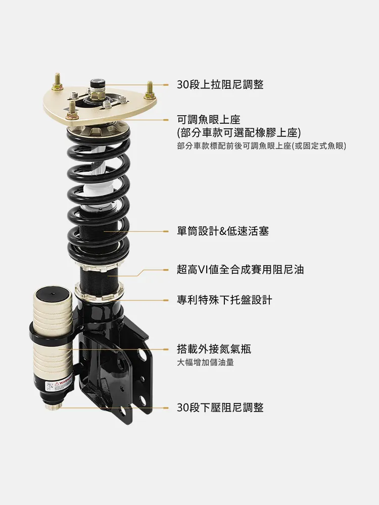 BC ER避震器是懸吊調校及車輛設定的進階產品。ER系列提供了30段上拉及30段下壓獨立調整功能,搭載的外接氮氣瓶所增加的油量,有助於散熱並抑制油溫上升。對於希望在上拉及下壓設定上有更多調整需求的使用者而言,BC Racing ER系列避震器是絕佳的選擇。