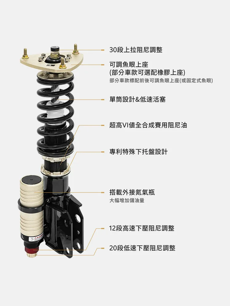 BC ZX系列提供迄今為止BC Racing避震器系統中最多的可調性。ZX系列是專為競速及賽道開發的3向可調避震器,提供20段低速下壓、12段高速下壓及30段上拉阻尼調整功能。ZX採用正立式筒身,保留更換上座的可能性,結合DS與ER優異的產品特性,加上超高VI值賽用阻尼油,可長效維持ZX系列在賽道與飄移競技中的優異性能。