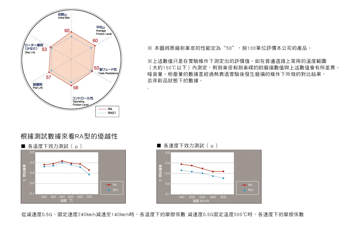 相容ABS的賽車煞車片,極力抑制ABS介入,可以用於衝刺賽,發揮出高初期制動力,隨腳踏力的大小線性煞車,可控制性好,適合各種駕駛習慣;合搭配高抓地力輪胎、半熱熔胎、熱熔胎。